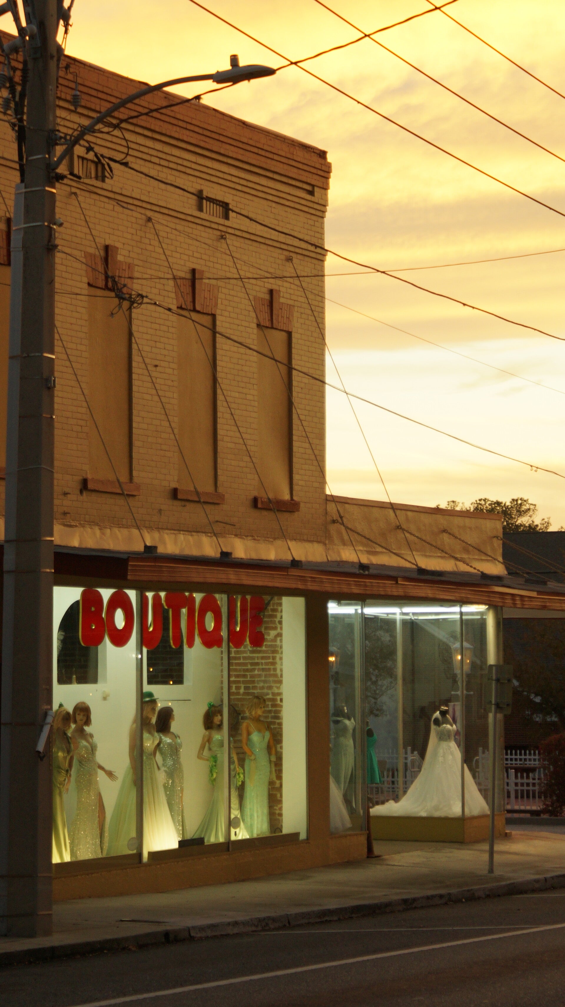 inside the glass it is a total fever dream. you have these mannequins just standing there in sparkly prom dresses and a giant wedding gown like they have been waiting for a dance that was cancelled twenty years ago. the red "BOUTIQUE" letters look so aggressive against the quiet street and it is just fucking haunting how still it all is. while everyone else is out here losing their minds over the latest trends or some stupid viral video these plastic girls are just chilling in their sequins and lace.